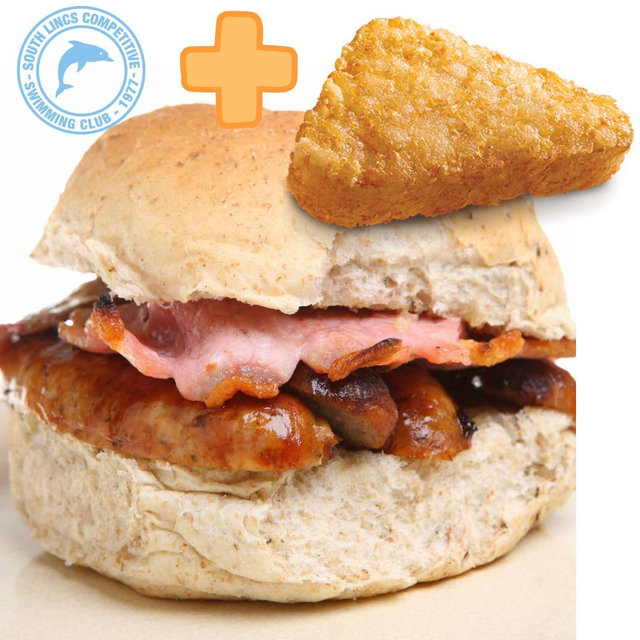 Two pieces of Bacon, Two Lincolnshire Sausages, One Hash Brown in a Bap. Red or Brown Sauce optional.
